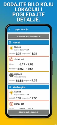 Kroz naprednu GPS tehnologiju, ovaj intuitivni alat automatski prepoznaje vašu trenutnu lokaciju, pružajući vam precizne podatke o izlasku i zalasku sunca. No, njegova funkcionalnost tu ne prestaje. Omogućuje vam dodavanje i praćenje više željenih lokacija, što je idealno za planiranje putovanja ili brigu o bliskima na daljinu. Detaljno prikazuje ne samo vremena izlaska i zalaska sunca, već i ključni period zlatnog sata, savršenog za fotografiranje, kao i precizne informacije o izlasku i zalasku mjeseca. Svaki podatak je tu, na dohvat ruke, kako biste mogli planirati svaki trenutak s apsolutnom sigurnošću.
