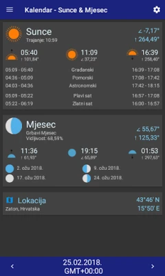 Za ljubitelje prirode koji traže više od estetskih snimaka, ovaj program ide korak dalje. Na temelju solunarne teorije Johna Aldena Knighta, izračunava optimalne periode za aktivnosti poput ribolova i lova, predviđajući maksimalnu aktivnost životinja i riba ovisno o poziciji sunca i mjeseca. Uz to, aplikacija pruža detaljne informacije o vremenima izlaska i zalaska sunca i mjeseca, mjesečevim fazama i osvjetljenju, duljini dana, sumraku (civilnom, nautičkom, astronomskom) te azimutu i visini nebeskih tijela. S mogućnošću odabira lokacije putem GPS-a, karte ili adrese, automatskim prepoznavanjem vremenske zone i opcijama alarma i obavijesti, ova je aplikacija ultimativni alat za svakoga tko živi i radi u skladu s ritmom neba – od putnika i kampera do astronoma.