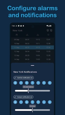 Nikada više ne propustite čaroban trenutak izlaska ili zalaska sunca. Predstavljamo vam vašeg osobnog asistenta za praćenje sunca, dizajniranog da vas informira i poveže s prirodnim ritmom dana. Uz precizne dnevne obavijesti, uvijek ćete znati točno vrijeme kada sunce izlazi i zalazi, omogućujući vam da planirate svoje aktivnosti ili jednostavno uživate u veličanstvenim prizorima. Zaboravite na brige uz prilagodljive alarme, opremljene i funkcijom odgode, kako biste s lakoćom uhvatili svaki poseban trenutak.