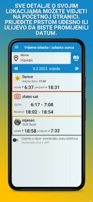 Kroz naprednu GPS tehnologiju, ovaj intuitivni alat automatski prepoznaje vašu trenutnu lokaciju, pružajući vam precizne podatke o izlasku i zalasku sunca. No, njegova funkcionalnost tu ne prestaje. Omogućuje vam dodavanje i praćenje više željenih lokacija, što je idealno za planiranje putovanja ili brigu o bliskima na daljinu. Detaljno prikazuje ne samo vremena izlaska i zalaska sunca, već i ključni period zlatnog sata, savršenog za fotografiranje, kao i precizne informacije o izlasku i zalasku mjeseca. Svaki podatak je tu, na dohvat ruke, kako biste mogli planirati svaki trenutak s apsolutnom sigurnošću.