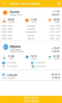 Za ljubitelje prirode koji traže više od estetskih snimaka, ovaj program ide korak dalje. Na temelju solunarne teorije Johna Aldena Knighta, izračunava optimalne periode za aktivnosti poput ribolova i lova, predviđajući maksimalnu aktivnost životinja i riba ovisno o poziciji sunca i mjeseca. Uz to, aplikacija pruža detaljne informacije o vremenima izlaska i zalaska sunca i mjeseca, mjesečevim fazama i osvjetljenju, duljini dana, sumraku (civilnom, nautičkom, astronomskom) te azimutu i visini nebeskih tijela. S mogućnošću odabira lokacije putem GPS-a, karte ili adrese, automatskim prepoznavanjem vremenske zone i opcijama alarma i obavijesti, ova je aplikacija ultimativni alat za svakoga tko živi i radi u skladu s ritmom neba – od putnika i kampera do astronoma.