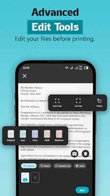 Sa Smart Printerom, ispisivanje nikada nije bilo raznovrsnije. Aplikacija vam omogućuje da bez napora ispisujete fotografije, slike, spremljene datoteke, pa čak i skenirane stranice. Bez obzira radi li se o dokumentima u PDF formatu, prezentacijama, važnim bilješkama ili izvještajima pohranjenim na vašem uređaju, Smart Printer osigurava precizan ispis. Funkcija pregleda datoteke pruža vam potpunu kontrolu, omogućujući vam da provjerite sadržaj prije nego što započnete s ispisom, uključujući i opciju skeniranja i ispisa direktno putem kamere vašeg telefona.