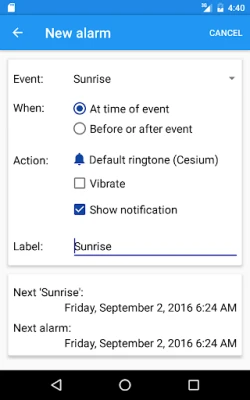 Kako biste osigurali da nikada ne propustite savršen trenutak, ova inovativna funkcionalnost obavijesti omogućuje vam da postavite podsjetnike za bilo koji od navedenih događaja. Možete odabrati želite li primiti alarm točno u trenutku izlaska ili zalaska sunca, ili pak postaviti obavijest određeno vrijeme prije ili poslije ključnog događaja. Bilo da se pripremate za fotografiranje zlatnog sata ili planirate večernju šetnju prije potpunog mraka, ova aplikacija osigurava da ste uvijek korak ispred, s prilagodljivim podsjetnicima koji se savršeno uklapaju u vaš raspored.