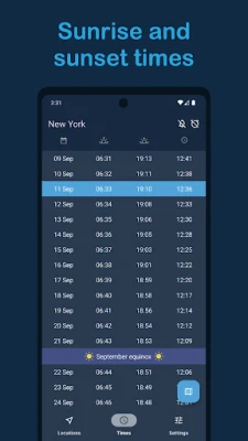 Otkrijte točna vremena izlaska, zalaska sunca i zlatnog sata za bilo koju lokaciju i datum. Ova aplikacija nudi jednostavno sučelje bez oglasa za pregled svih važnih svjetlosnih trenutaka dana.