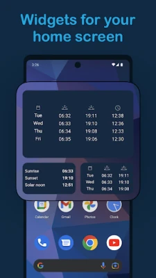Za potpunu praktičnost, aplikacija nudi intuitivni widget za početni zaslon koji prikazuje ključna vremena izlaska i zalaska sunca na prvi pogled. Automatsko otkrivanje vaše trenutne lokacije putem GPS-a osigurava uvijek relevantne podatke, dok mogućnost spremanja omiljenih lokacija olakšava brzi pristup informacijama za mjesta koja su vam važna. Uživajte u neprekinutom iskustvu bez reklama, fokusirajući se isključivo na ljepotu i preciznost sunčevog ritma.